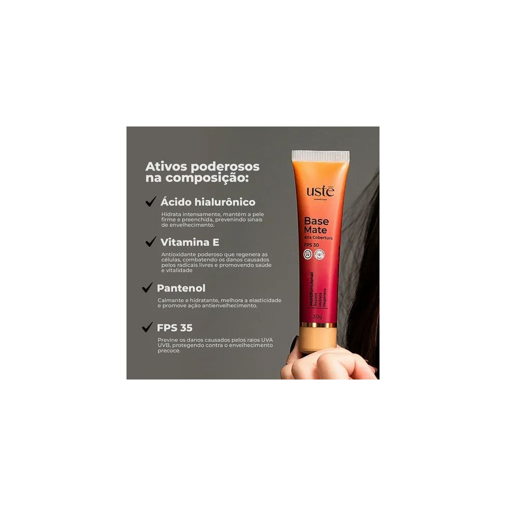A Base Matte Ustē Cosméticos MultiUp FPS 35 possui uma fórmula especial com ativos que garantem uma pele mais hidratada, protegida, com ação antioxidante que cuida da pele ao mesmo tempo que maquia. Além disso, possui resistência à água, composição vegana, hipoalergênica, dermatologicamente testada, livre de parabenos e cruelty free.