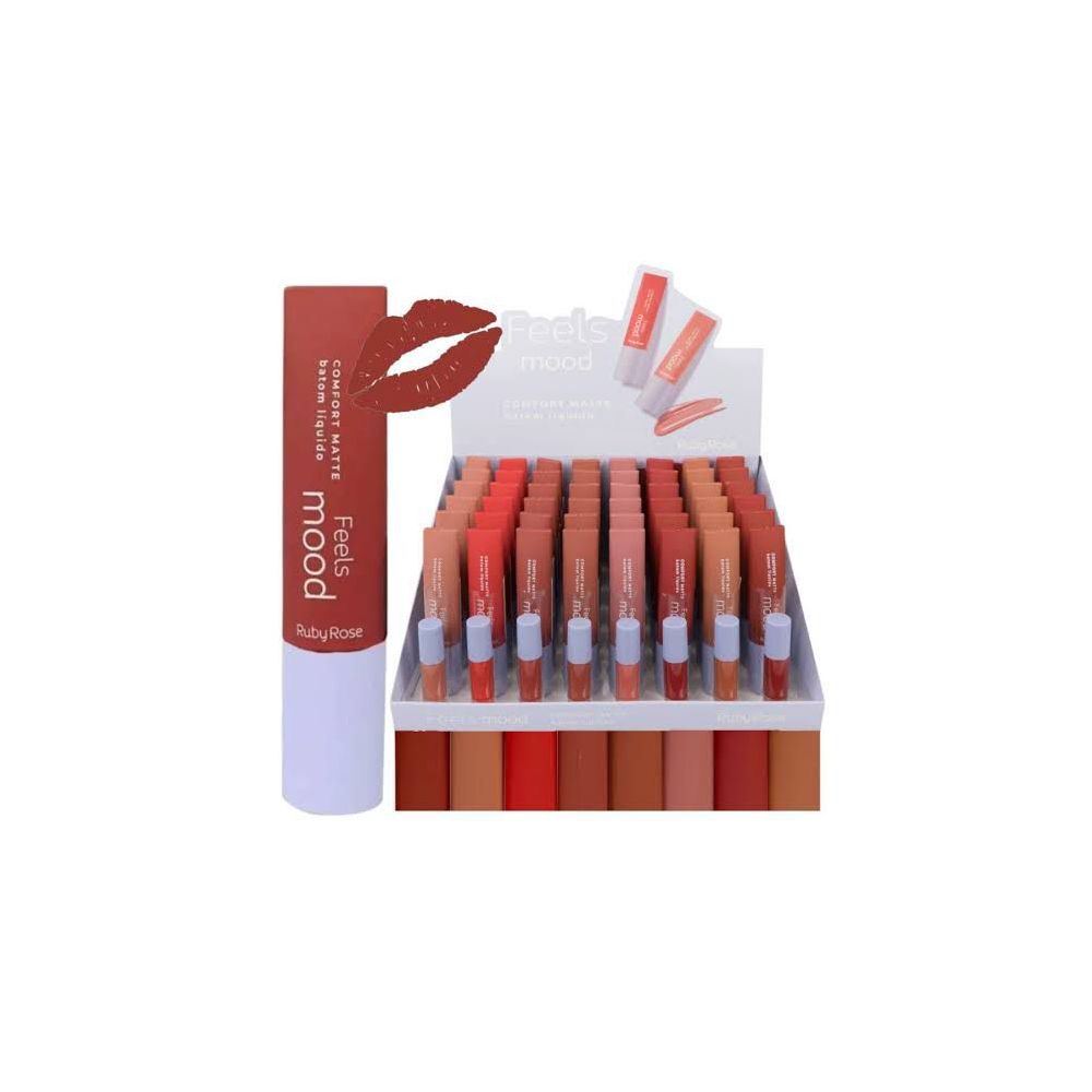 Batom líquido com acabamento matte. Ruby Rose Feels Mood Comfort Matte proporciona alta cobertura para os lábios, com longa duração e alta fixação.