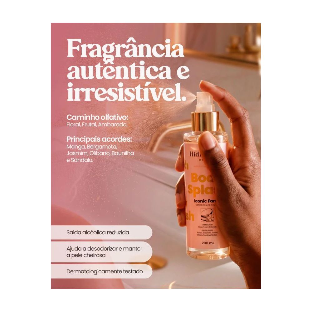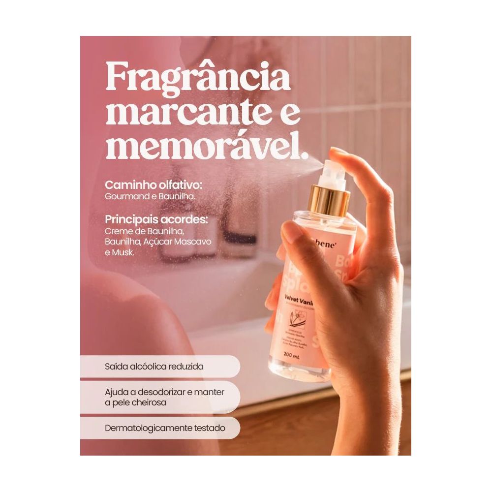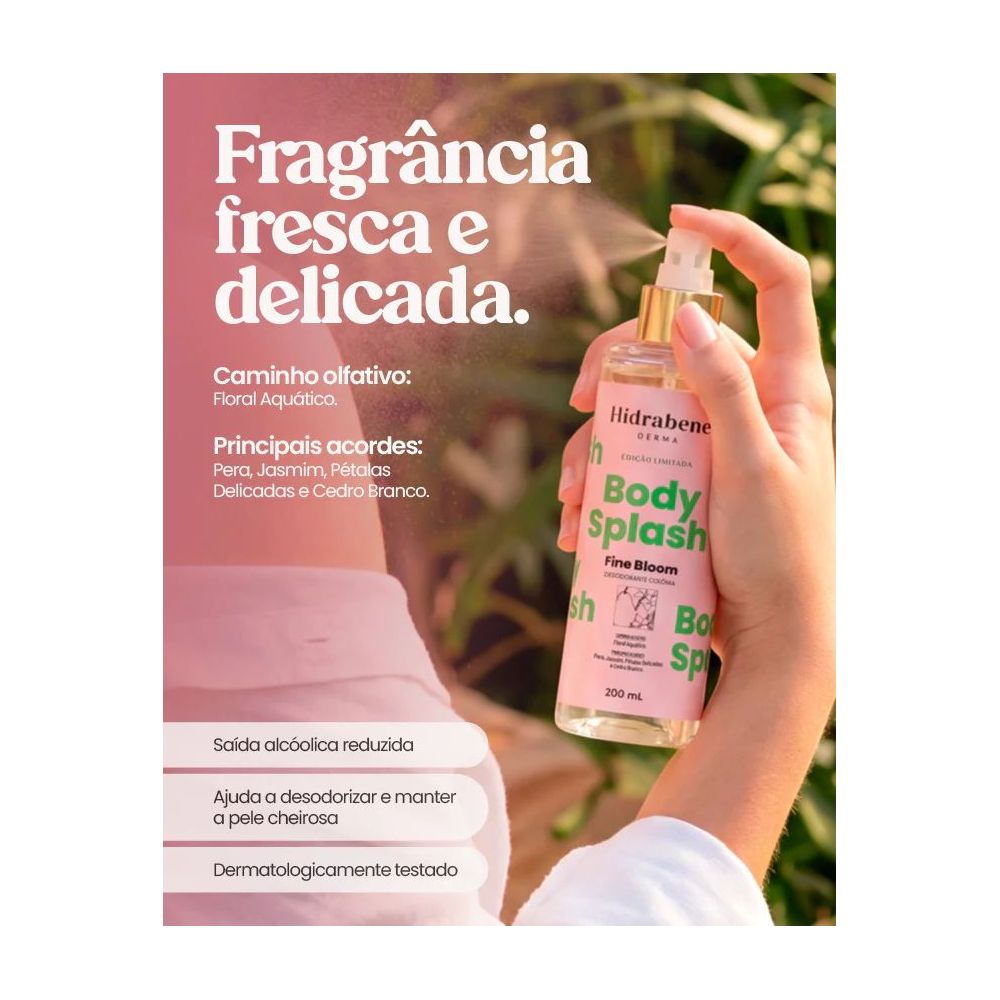 O Body Splash Hidrabene foi desenvolvido para perfumar delicadamente a pele, proporcionando sensação de frescor e bem-estar ao longo do dia. Com fragrâncias modernas e envolventes, é ideal para complementar a rotina de cuidados pessoais com um toque especial de perfumação.