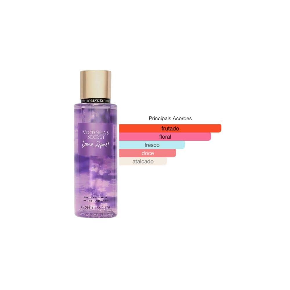 Se você gosta de um perfume suave e sexy, o Victoria?s Secret Love Spell pode ser uma boa escolha. Sua fragrância levemente adocicada e floral possui notas de áloe vera e camomila que relaxam a pele. O toque de pêssego, flor de cereja e jasmin branco são um chamado para ser refinada e sensual.