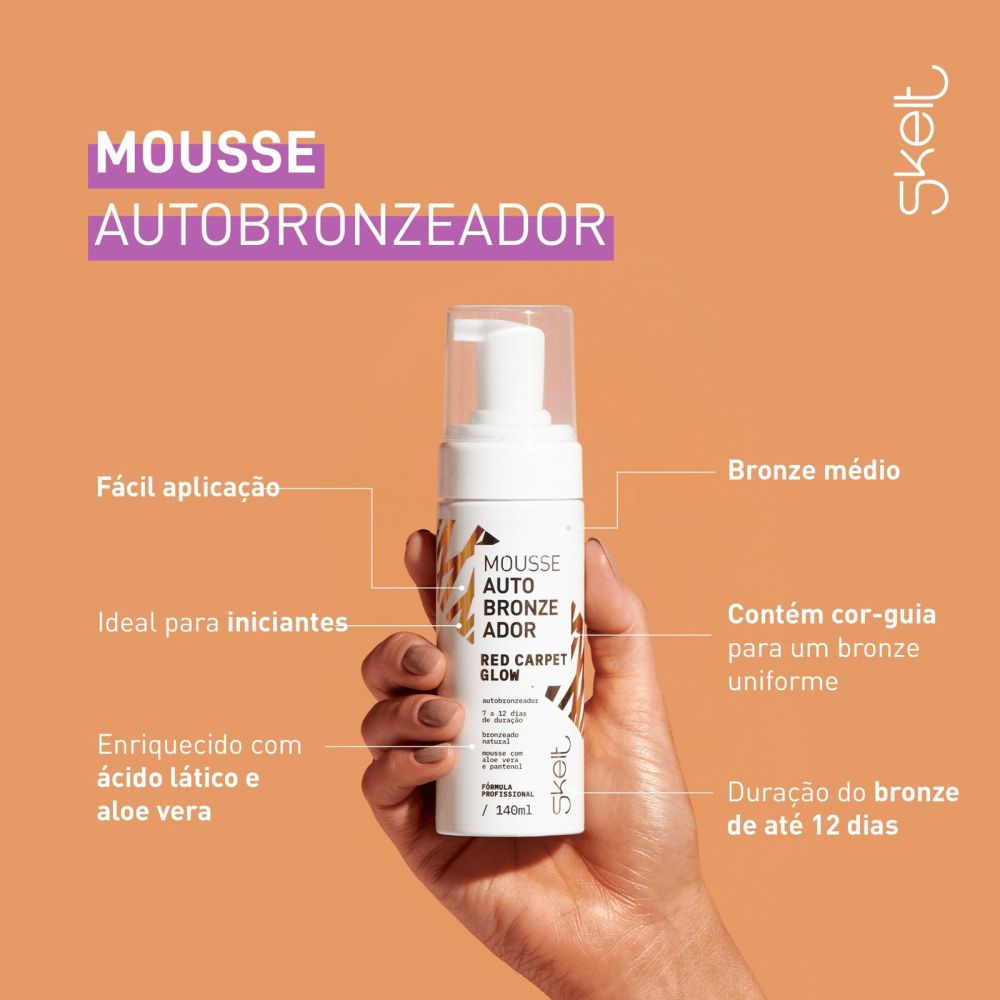 O Mousse Autobronzeador Skelt traz a mais avançada tecnologia em autobronzeamento. Sua fórmula contém ácido lático e aloe vera que auxiliam na hidratação da pele.
