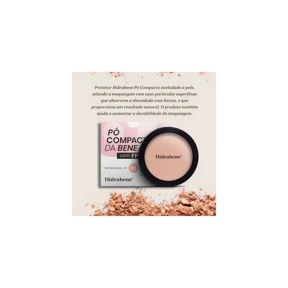 Hidrabene Pó Compacto da Bene FPS 50 promove acabamento com efeito matte e deixa a pele sedosa e aveludada. A alta proteção solar e os multibenefícios da Vitamina C resultam em uma pele com aspecto mais saudável, uniforme, firme e revitalizada.