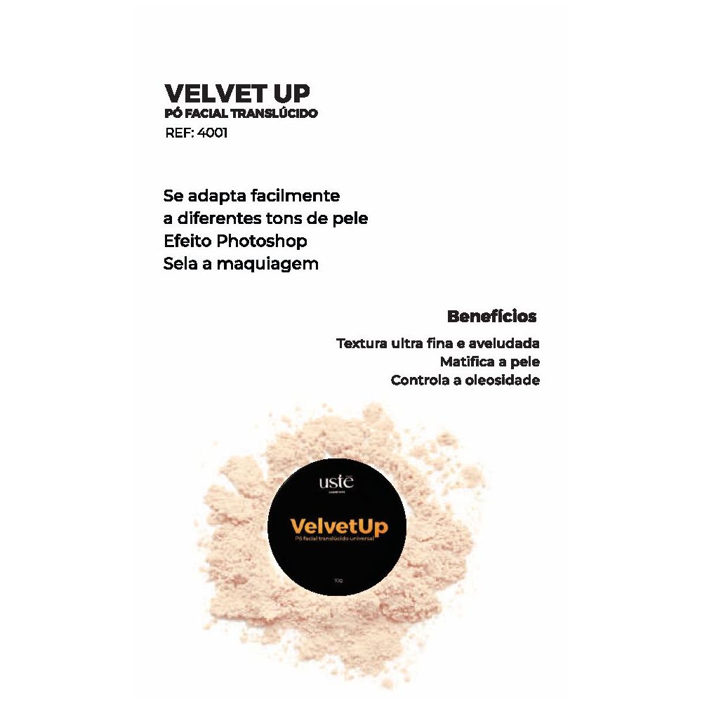 Pó solto translúcido. Ustē Cosméticos VelvetUp finaliza e sela a maquiagem, absorvendo a oleosidade e conferindo efeito impecável ao visual.